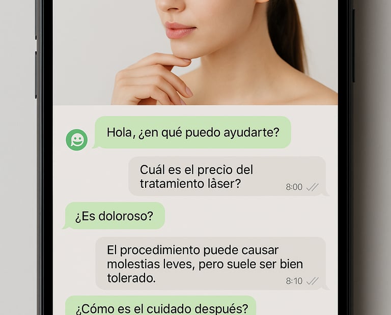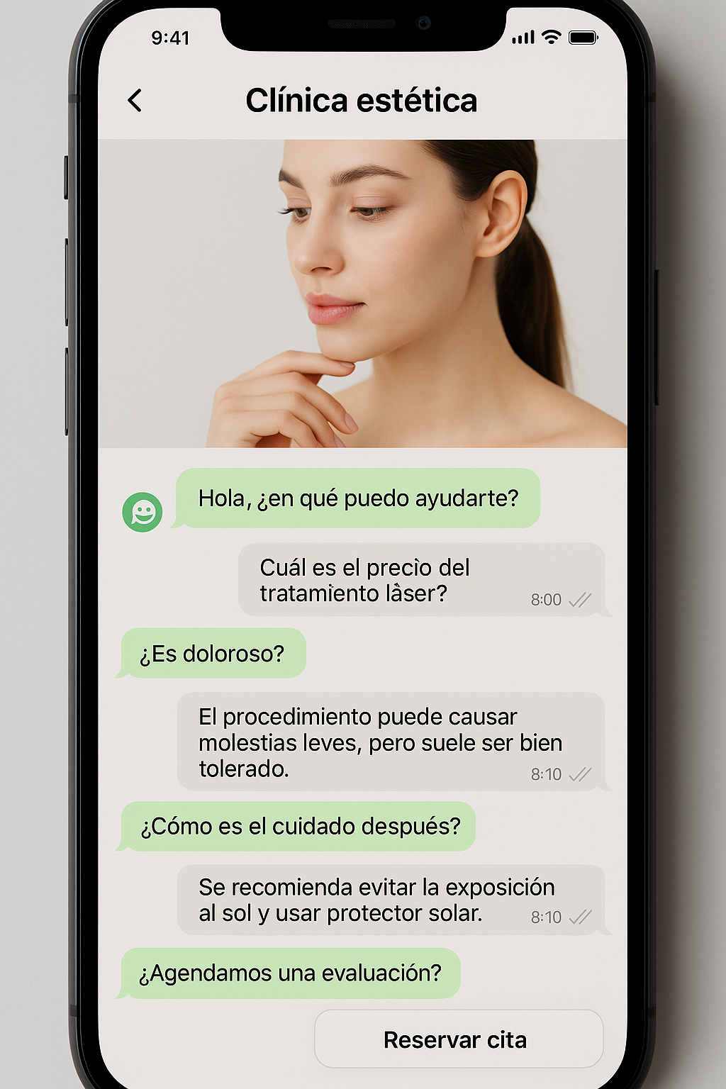 Al mismo tiempo, el equipo de recepción pierde muchas horas respondiendo siempre lo mismo: “¿cuánto cuesta?”, “¿duele?”, “¿puedo hacerme esto si…?”, “¿hay disponibilidad esta semana?”. En estética ya se están usando chatbots con IA incluso para análisis preliminar de piel a partir de fotos.